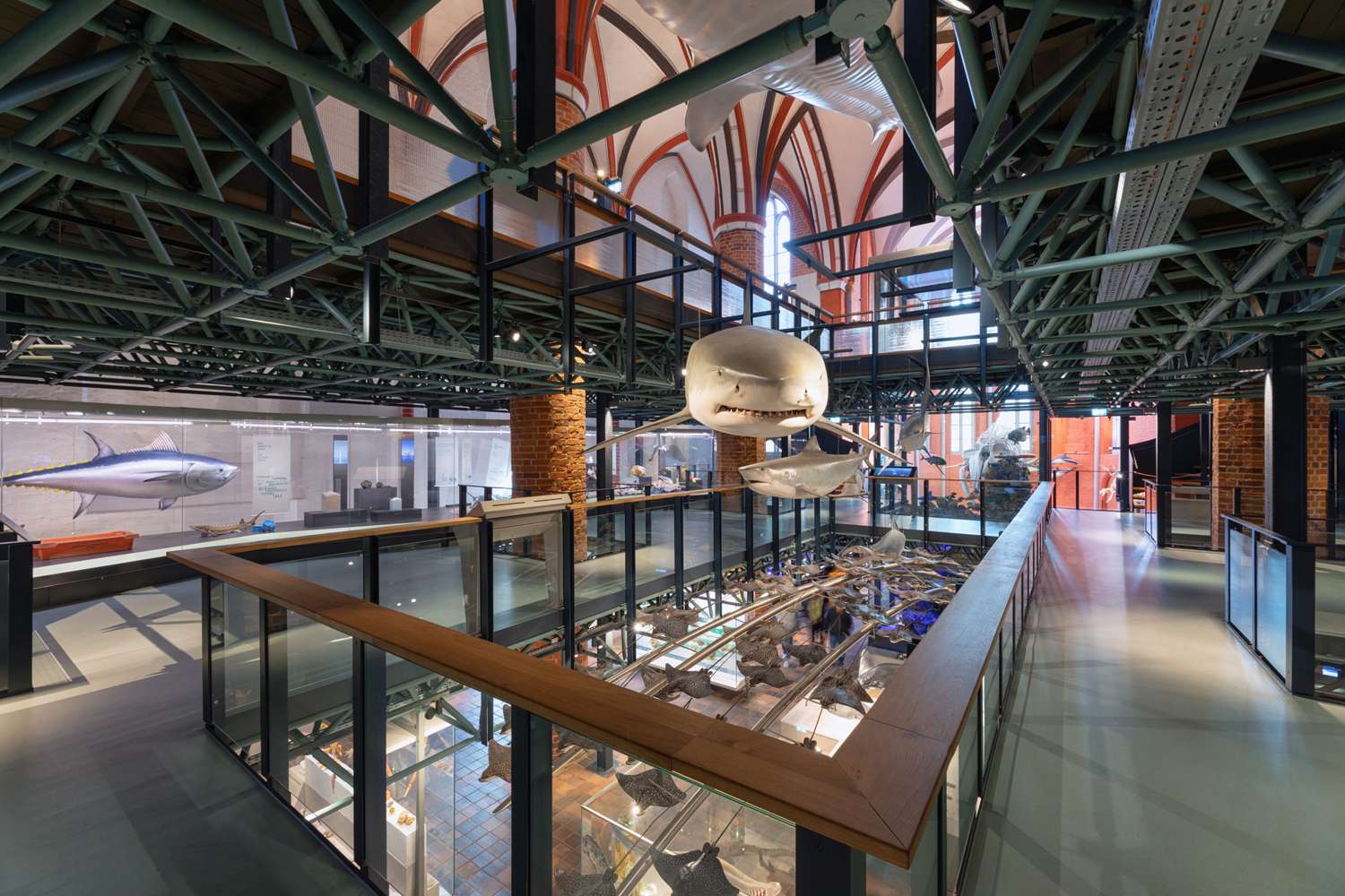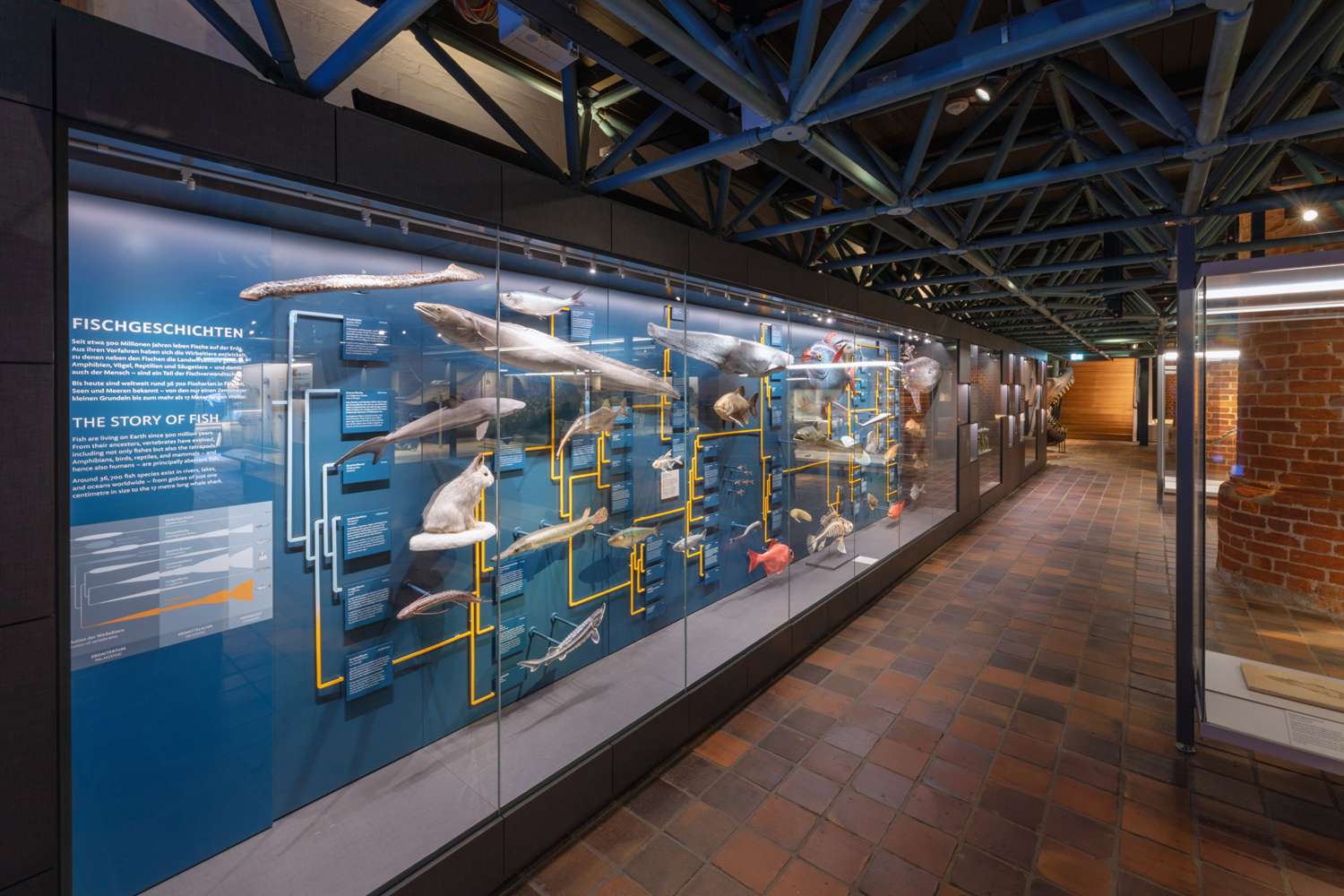Produktion, Lieferung und Montage von ca. 40 Stück. Vitrinen in verschiedenen Ausführungen und Größen: Wandvitrinen, freistehende Vitrinen, Tischvitrinen, raumübergreifende Vitrinenanlagen und Ausstellungswände | 21 Stück Medienstationen aus Mineralwerkstoff | 80 Meter Wandvitrinen mit gebogenen Gläsern in Wellenform | 7 Stück Sitzmöbel in Sonderform aus Formschichtholz | 9 Stück Sitzbänke inklusive Höhrstation und Medienladestation | Diverse Podeste, Sockel und Texttafeln | Szenografisches Licht/Vitrinenbeleuchtung | Grafikproduktion